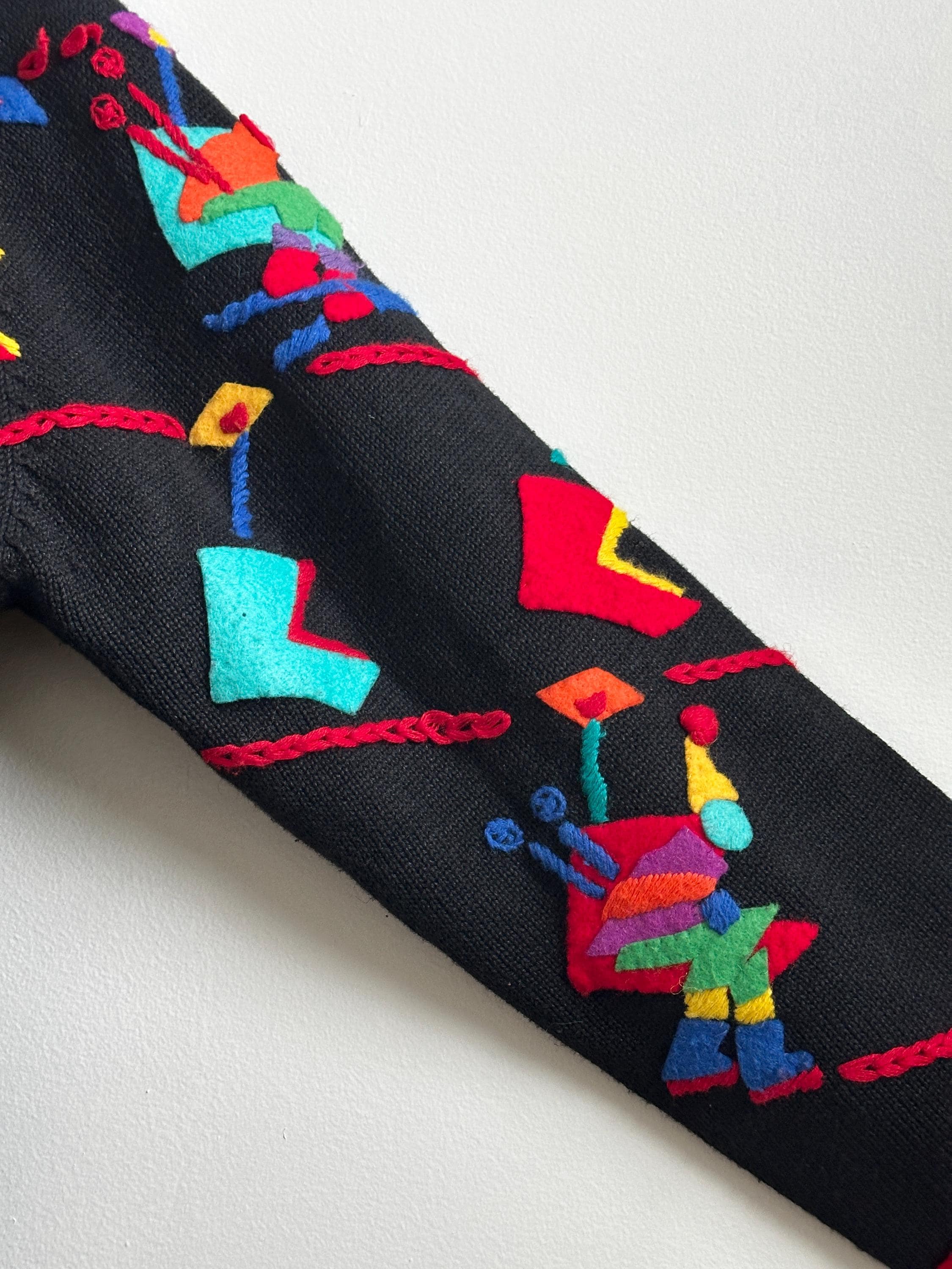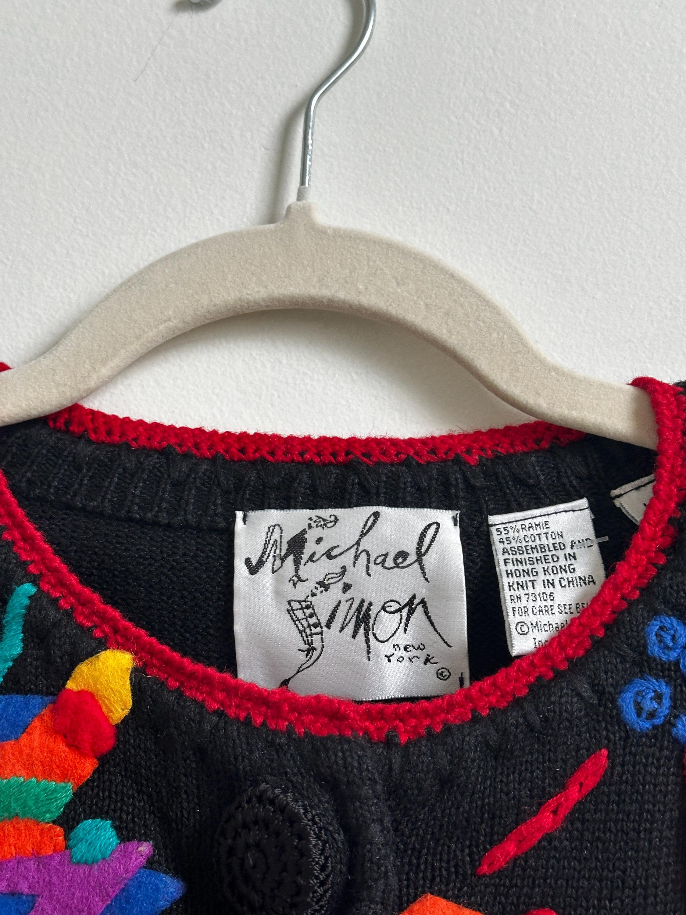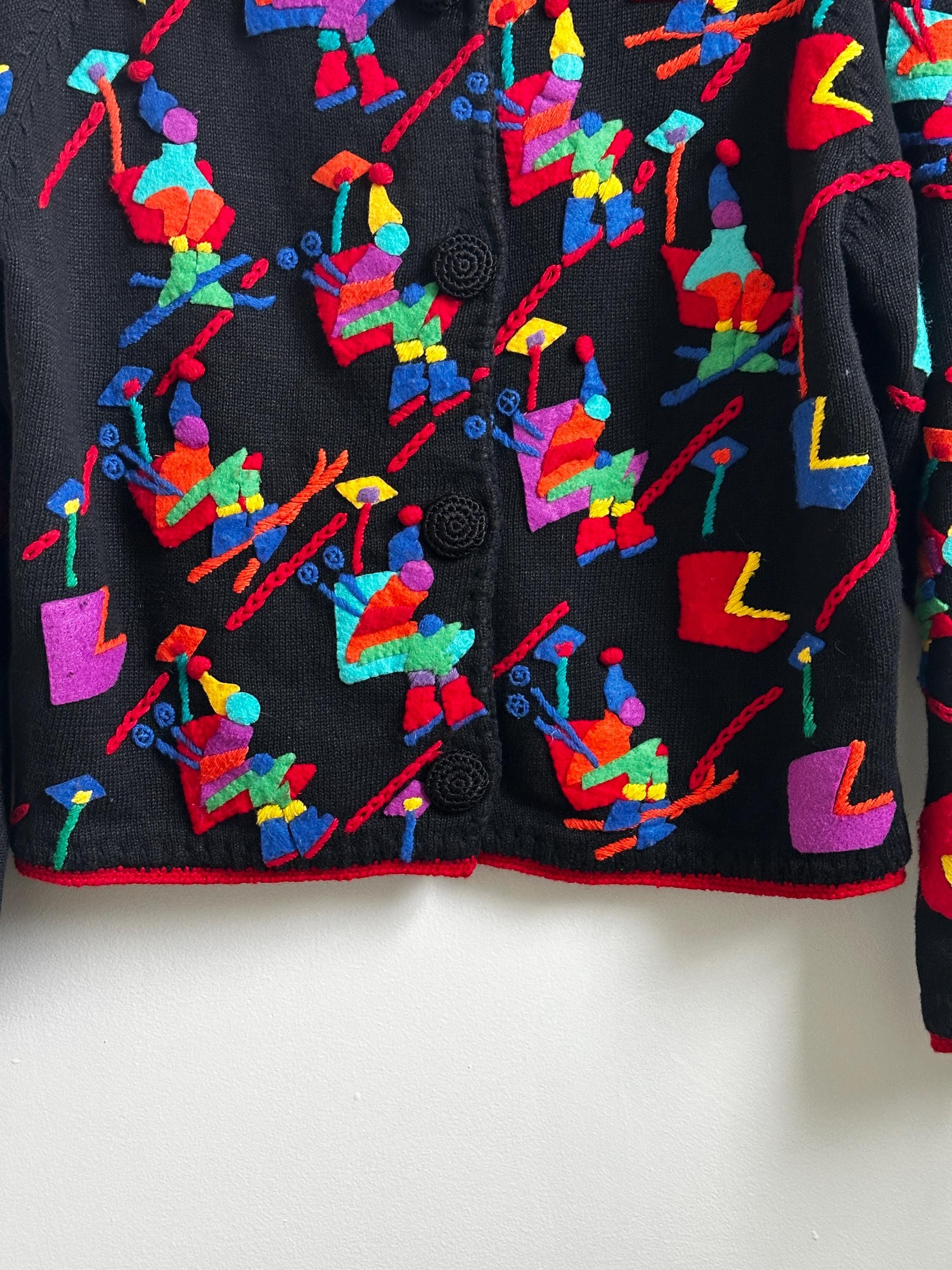 AMAZING Michael Simon cardigan depicting various, multicolor skiers