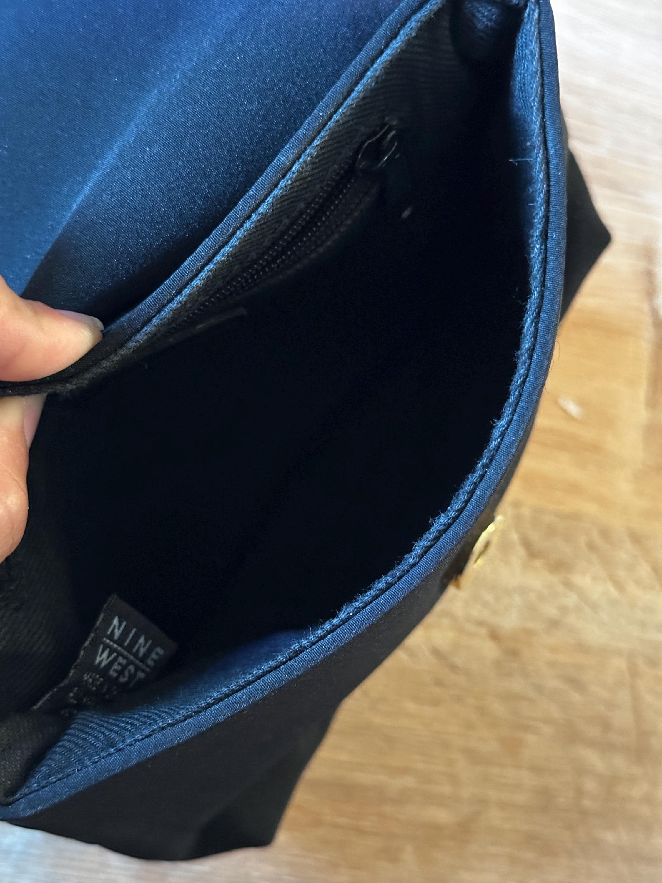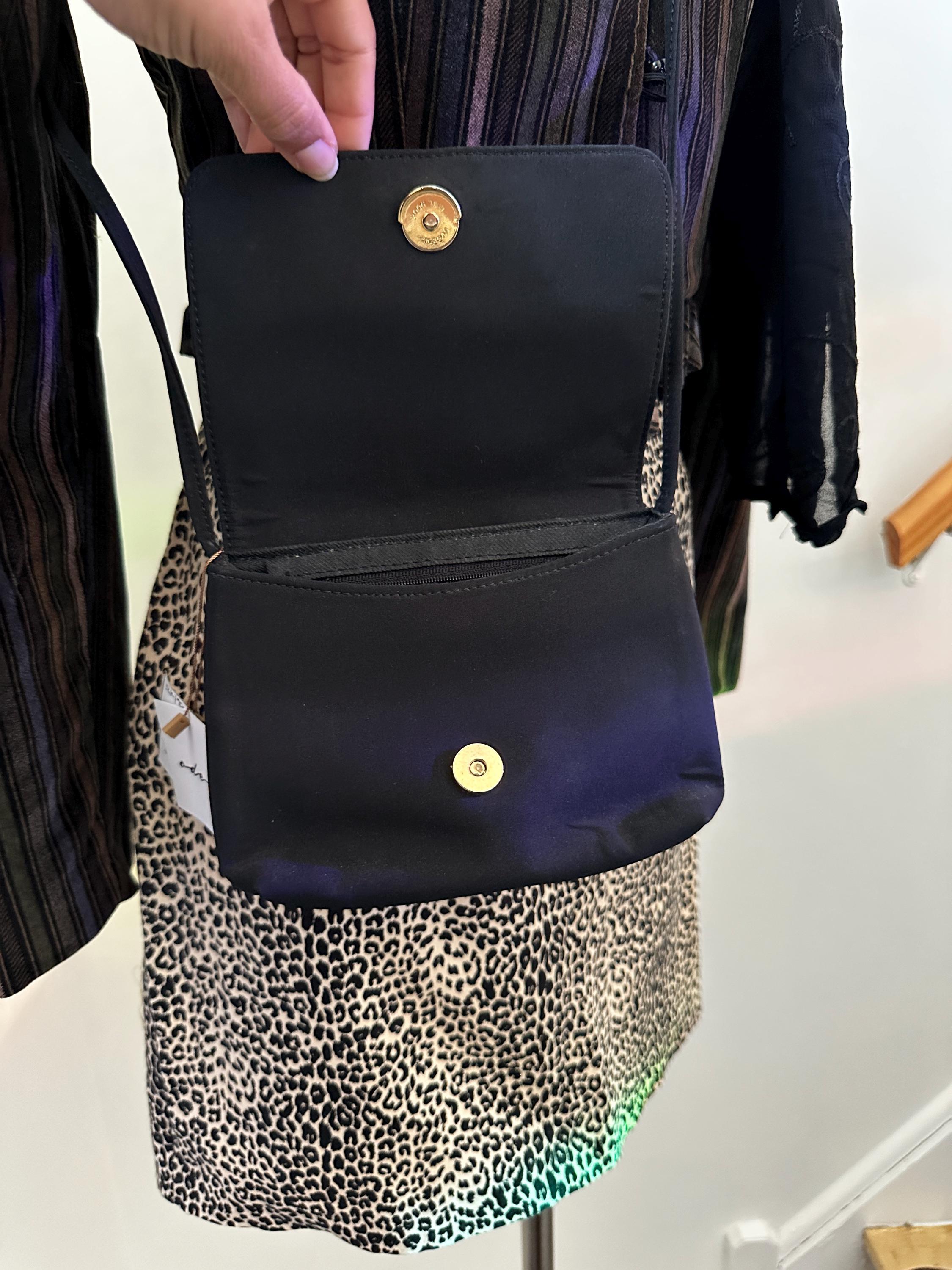 Three compartments: Large interior pocket, smaller zippered pocket and small open pocket in back