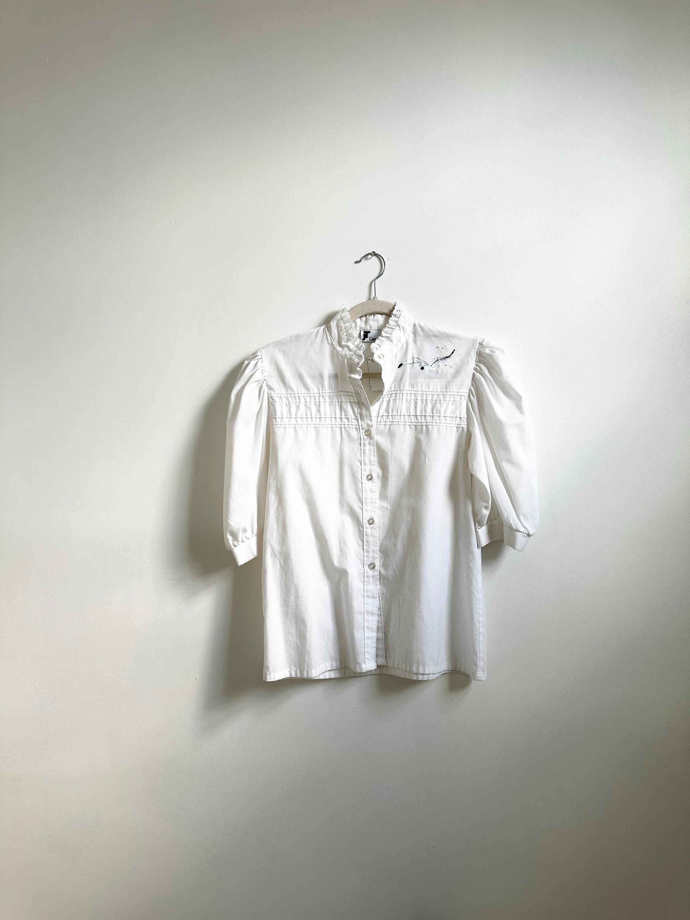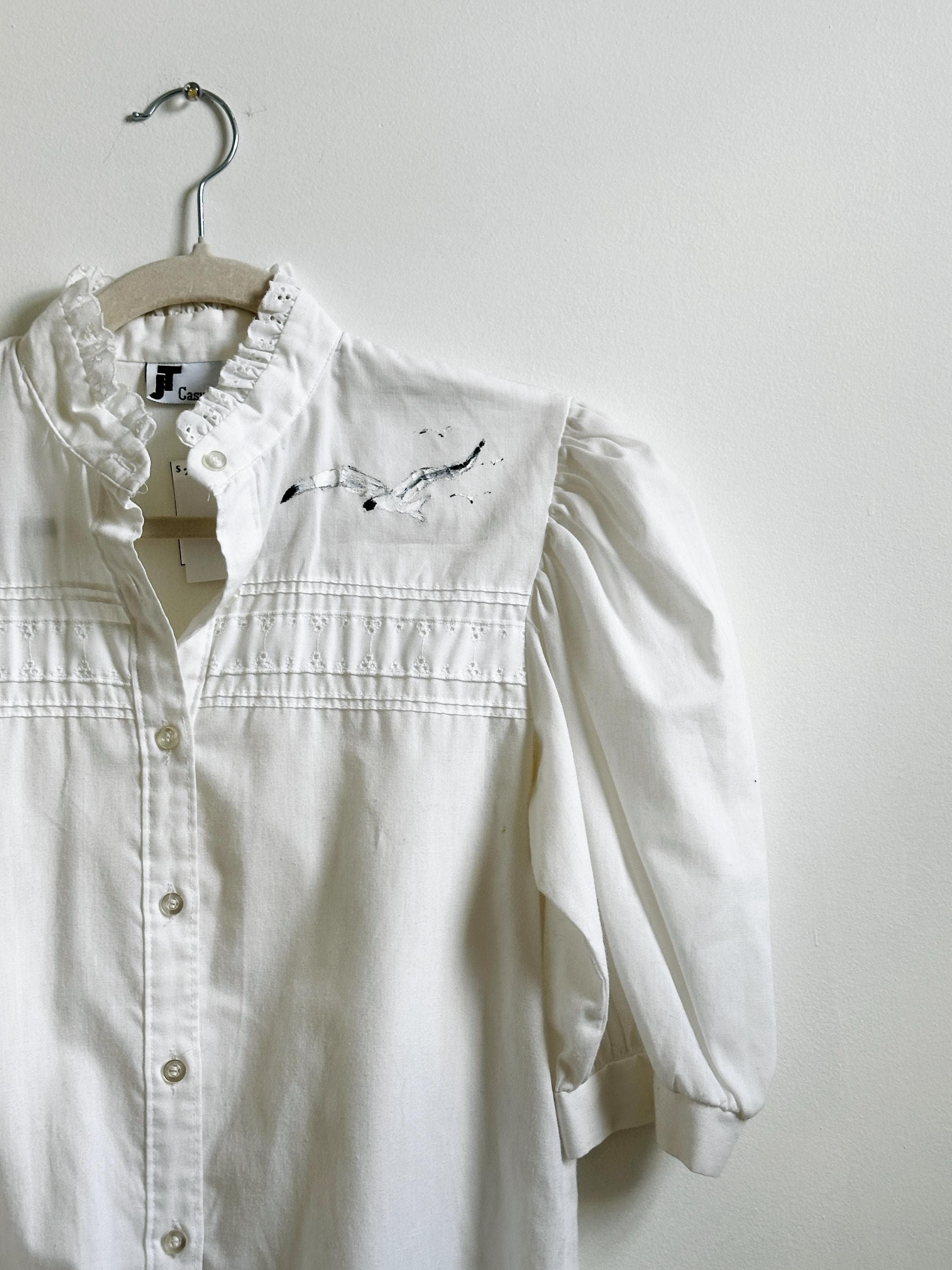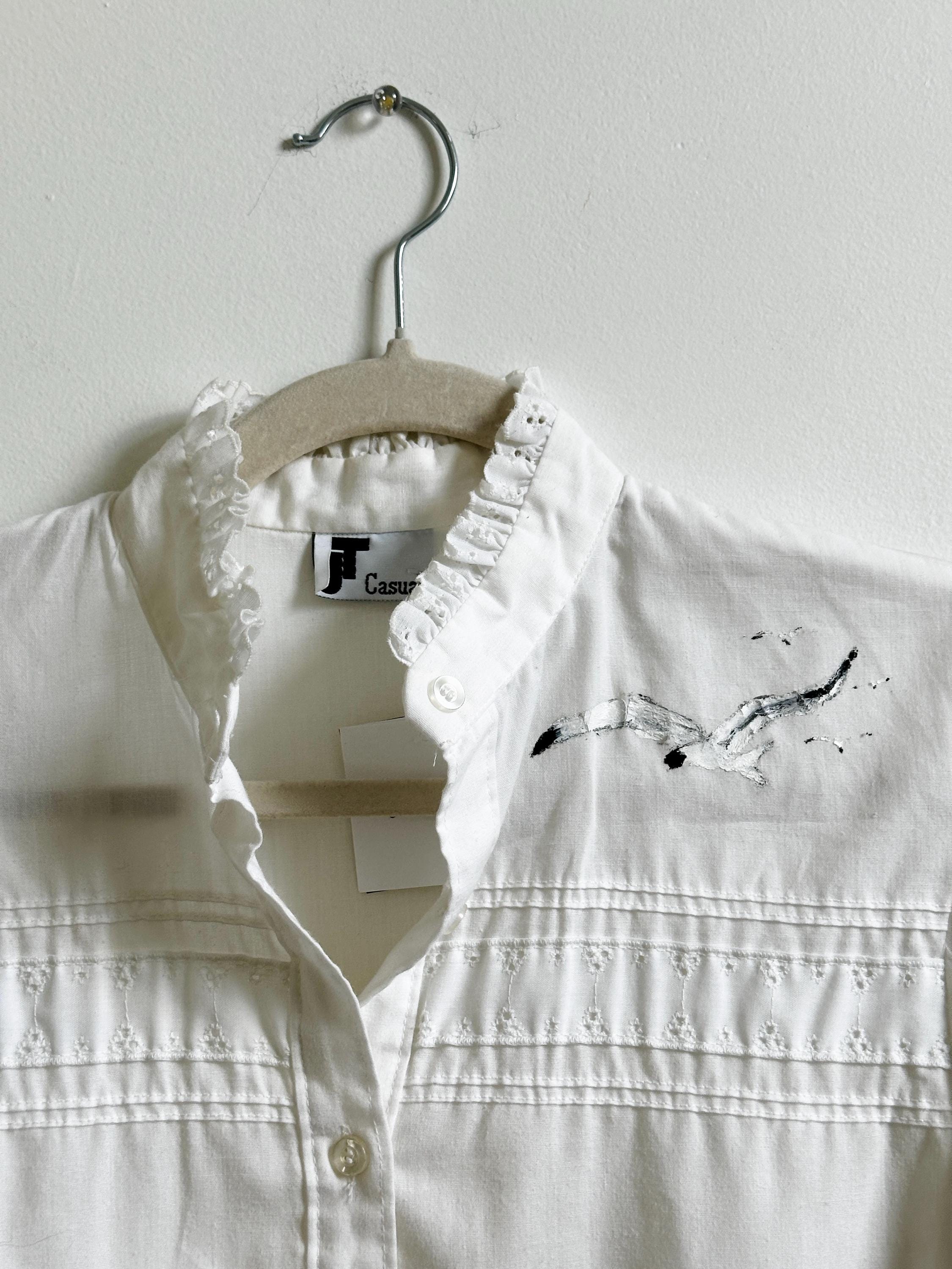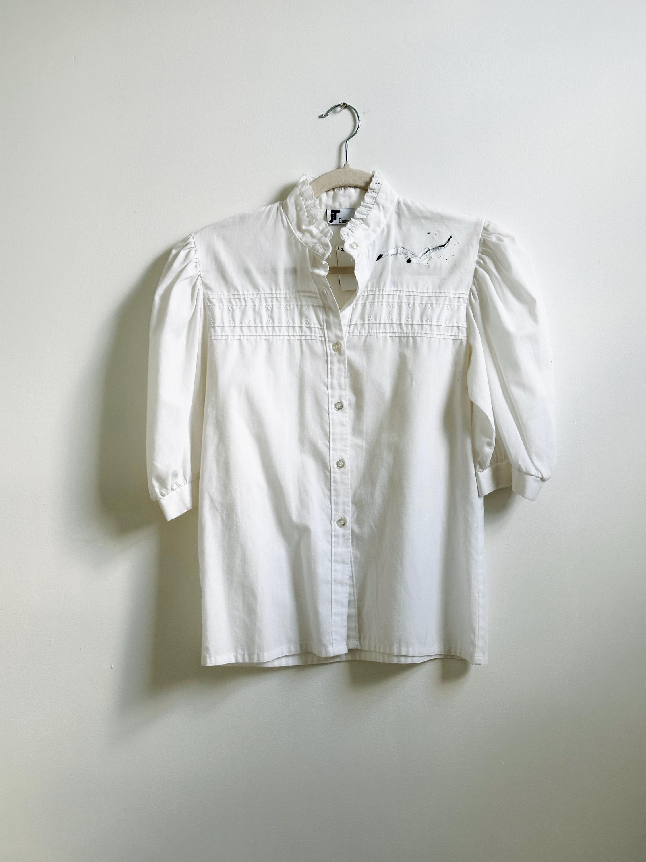 Short sleeve, ruffle neck blouse with one of a kind, handprinted bird in flight