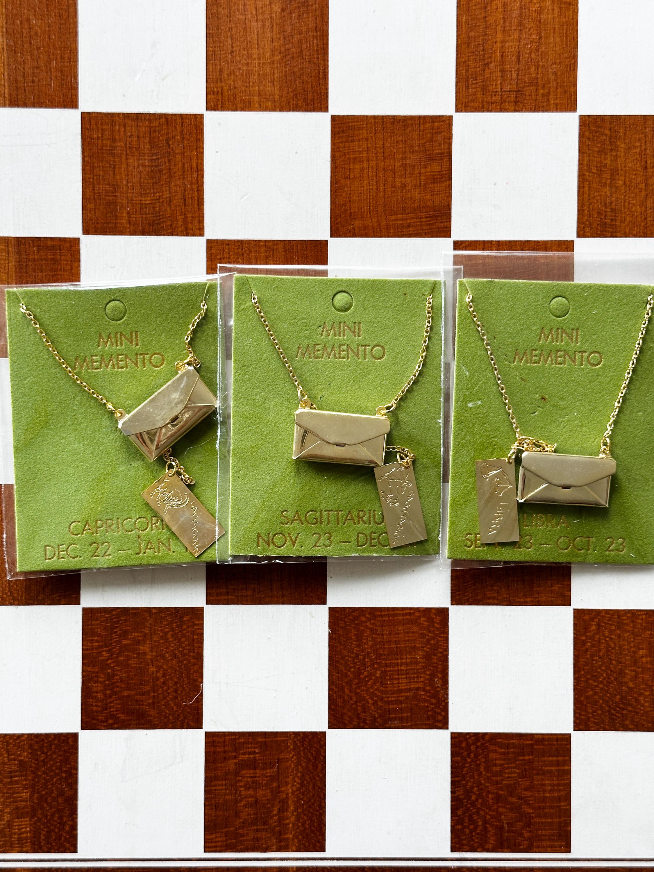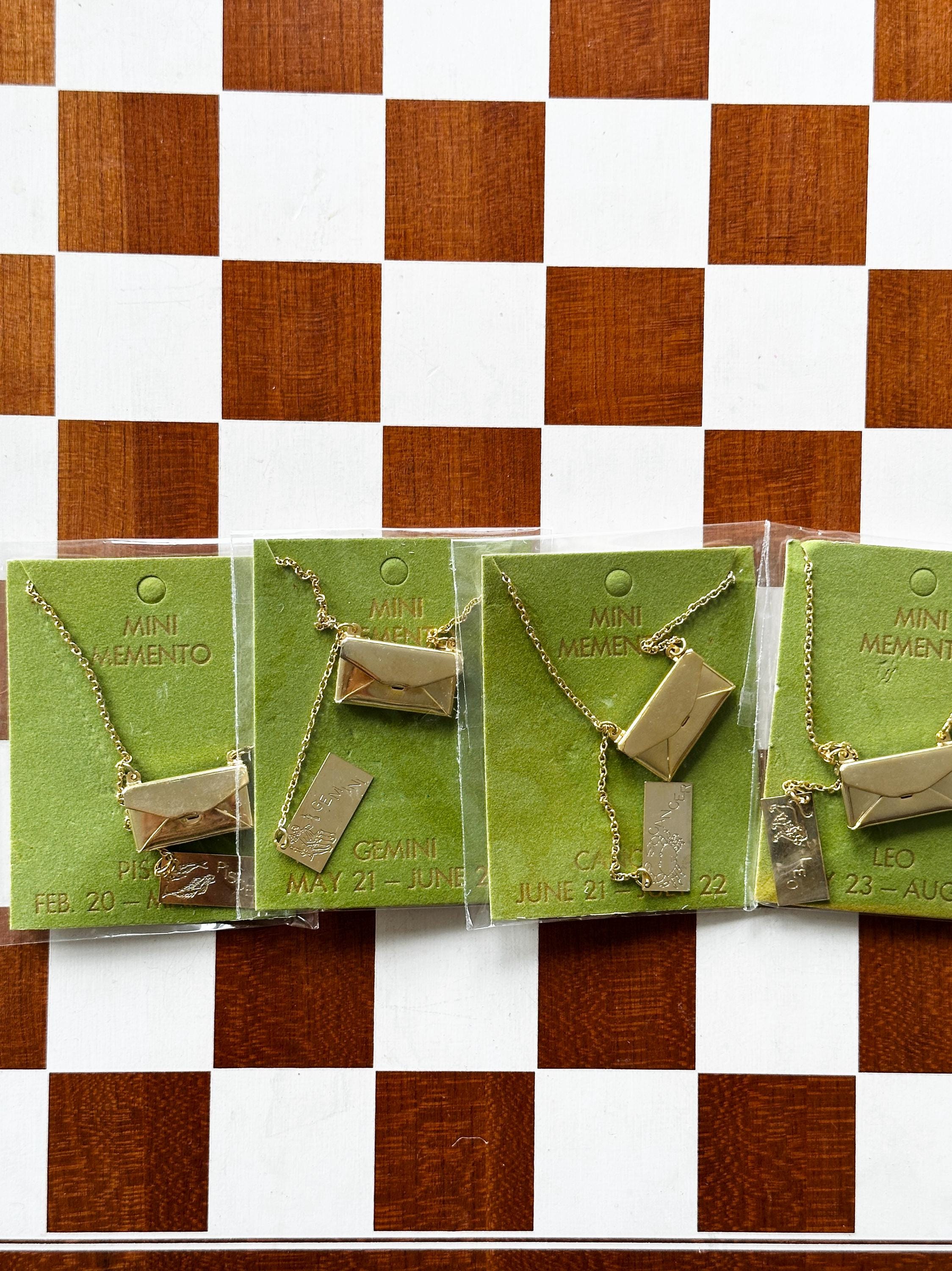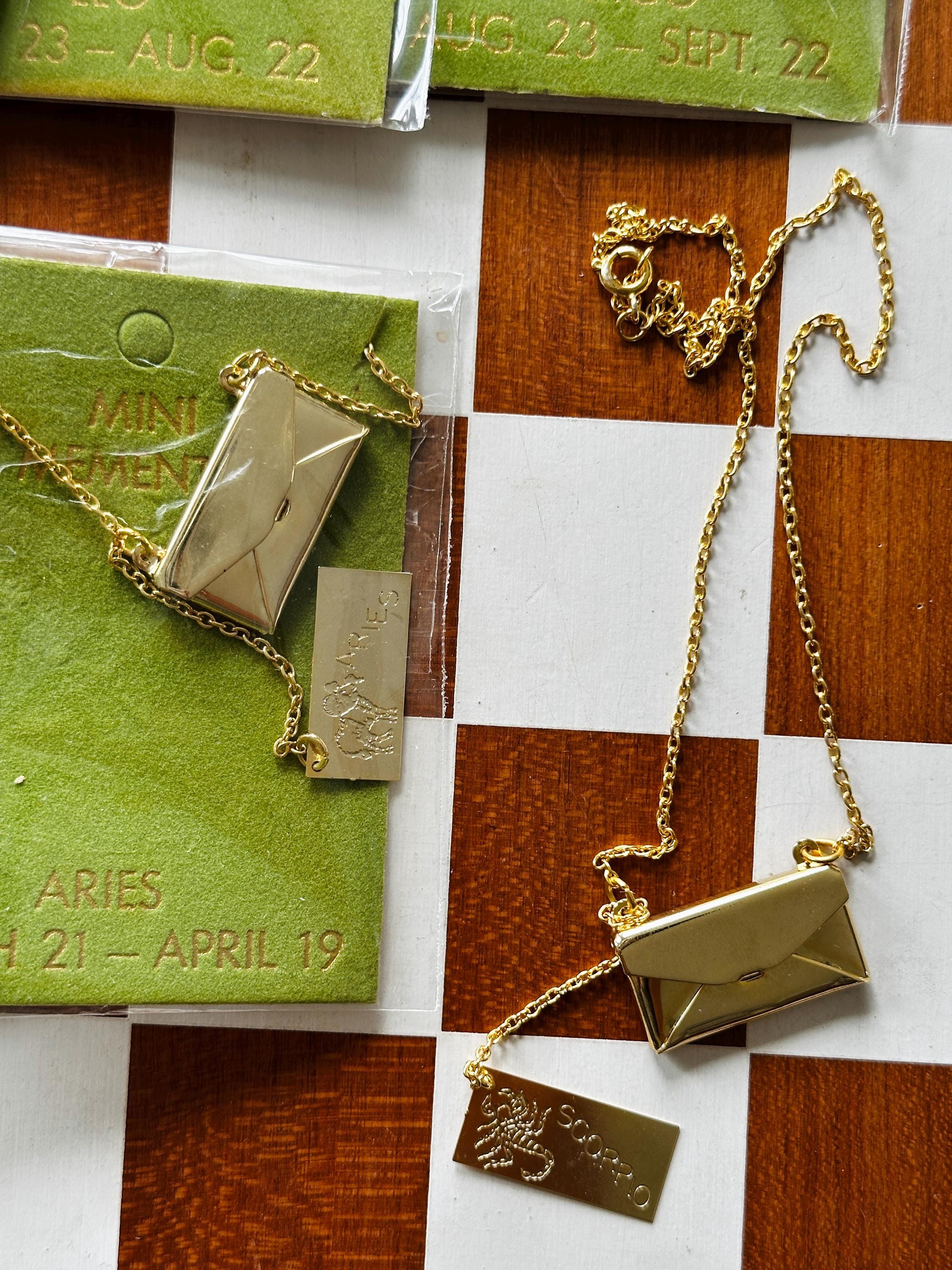 Gold-plated envelopes with zodiac "letters" inside. Functional envelope with letter attached by chain
